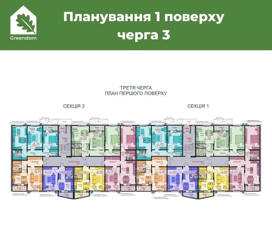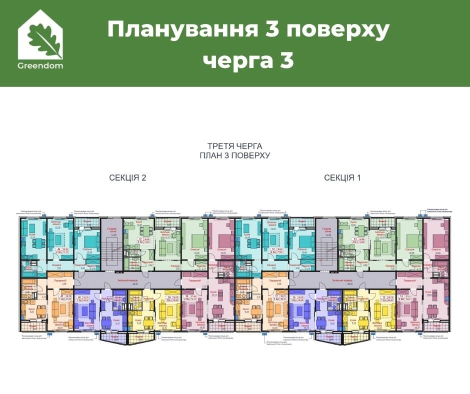 В кожній секції 3 однокімнтані та 3 двокімнтані квартири.